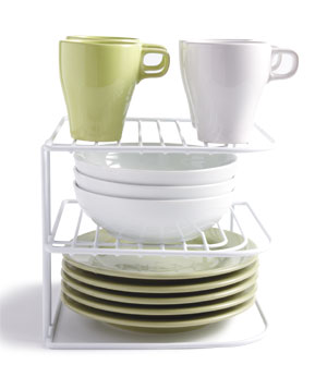 A simple shelf tidy like the one pictured is low-cost and allows you to stack your items neatly, meaning you can often double or triple the space that you have within your shelves.
