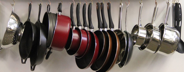 Installing rails can be a very cheap and simple way to move pots and pans out of the cupboards and free up a lot of space. A rail from Ikea can be a perfect solution for this. Install the rail and then get some strong hooks and you can hang your pots and pans from it to also add a bit of rustic charm to your kitchen.