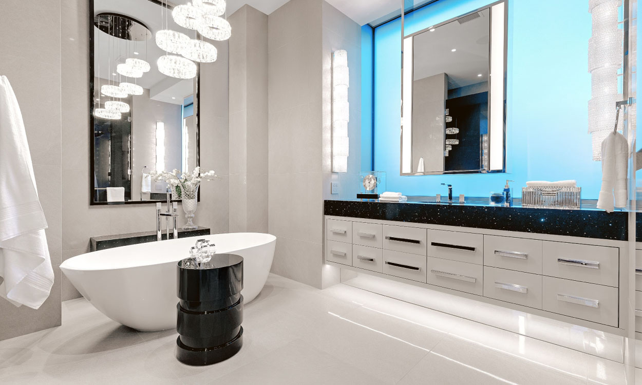 While there’s nothing wrong with making use of LED lighting strips around your smaller bathroom features or vanity mirrors, having one large fixture for light gives off that perfect combination of expense and minimalism.